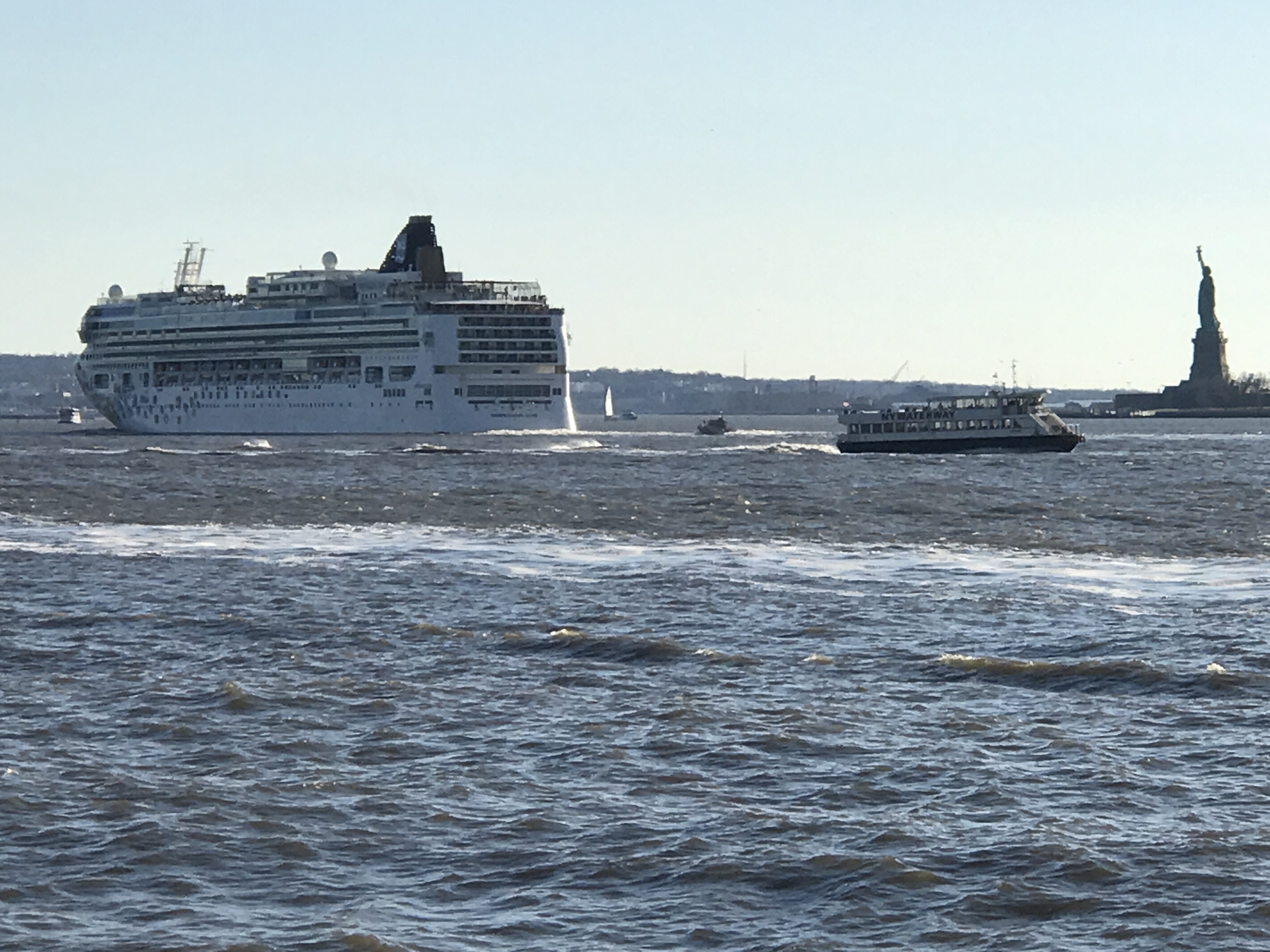 Cruiseship MV ‘Norwegian Gem’ departing New York Harbor; photographed as vessel was passing the Statue of Liberty. Image credit: Karatzas Images.